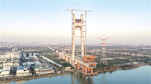 ■深江铁路洪奇沥水道公铁大桥50号墩主塔顺利封顶。单位供图