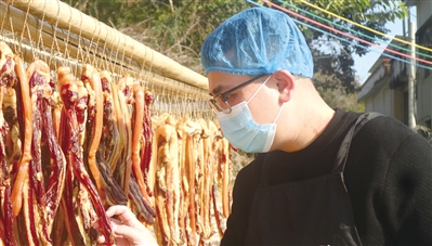 ■刘育成在检查腊肉晾晒情况。全媒体记者彭新启/摄