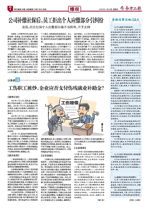 - 工伤职工被炒,企业应否支付伤残就业补助金? ■资料配图 【案情回放】 2023年6月12日,吴先生入职某检测公司任外检测工,公司为其缴纳社会保险。2024年1月18日,吴先生在工作中受伤,诊断为右侧第六肋骨骨折,后被认定为工伤(拾级伤