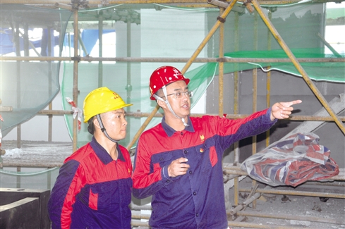 ■曾梦阳(右一)在云硫矿业碎磨系统大型化自动化改造项目现场工作。