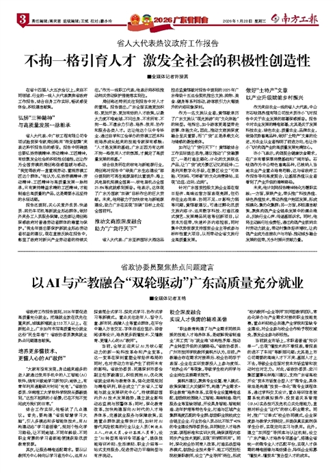 - 以AI与产教融合“双轮驱动”广东高质量充分就业 省政府工作报告提到,2026年要促进高质量充分就业。把稳就业放在优先位置来抓,城镇新增就业110万人以上。在新起点上,广东如何书写高质量充分就业这份“民生答卷”?省政协委员聚焦就业热点问题建言献策