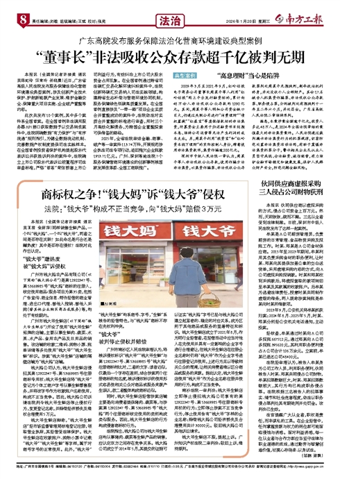 - “董事长”非法吸收公众存款超千亿被判无期 本报讯 (全媒体记者许接英 通讯员陈虹伶 汪育玲 孙晓晨)近日,广东省高级人民法院发布服务保障法治化营商环境建设典型案例,涉及创新产业技术保护、护航新能源产业发展、维护金融安全、保障重大项目实施、