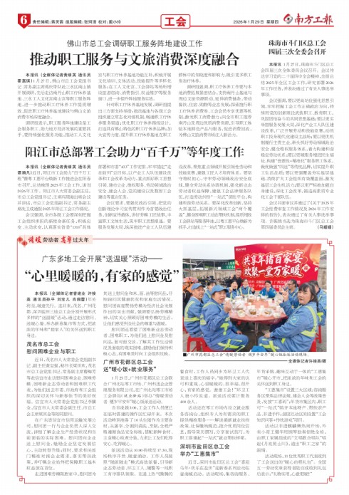 - 阳江市总部署工会助力“百千万”等年度工作 本报讯 (全媒体记者黄细英 通讯员谭漪凡)近日,阳江市工会助力“百千万工程”暨粤工惠平台焕新工作推进会在阳春市召开,总结梳理2025年工会工作,谋划2026年工作。阳江市人大常委会副主任,市总工会