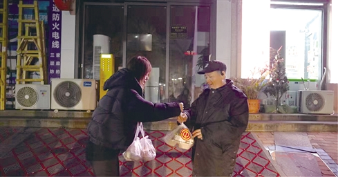 ■周舒(左)为环卫工送早餐。 单位供图