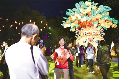 ■市民在“大吉大利”灯组前拍照留念。钟振彬/摄