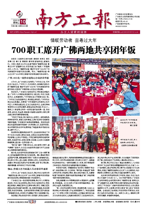 ▲2026年广州市新春团年饭慰问活动现场。穗工宣/摄 ◀年夜饭开启前,职工选购佛山特色年货。全媒体记者林景余/摄 本报讯 (全媒体记者许接英 黄细英 林婷玉 通讯员粤工宣 穗工宣 霍嘉琪 蔡华琪)