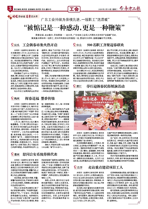 - “被惦记是一种感动,更是一种鞭策” 挥春送福、走访慰问、民俗展演……连日来,广东各级工会深入开展形式多样的“送温暖”活动,聚焦重点群体和一线职工,把关怀和服务送到基层一线,营造欢乐祥和、温暖温馨的节日氛围。