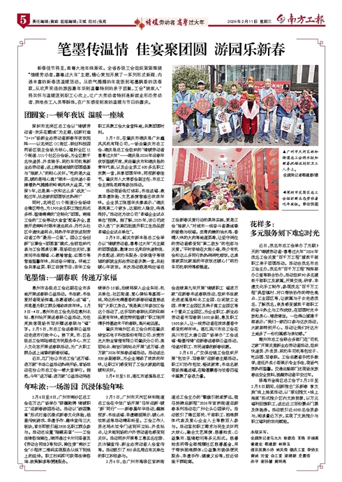 ▲广州市天河区林和街道总工会将水饺和新春祝福送到环卫工人手上。 全媒体记者郗建新/摄 ◀深圳市龙岗区总工会组织新业态劳动者吃年夜饭。单位供图 本版采写: 全媒体记者马大为 彭新启 王