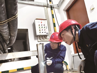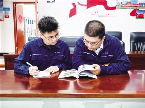 ▲公司青年技术能手李沛佳(右)正向身旁的年轻徒弟梁荣枫细致讲解风机系统结构原理。