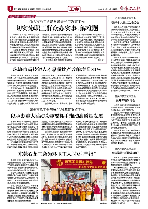 - 珠海市高技能人才总量比产改前增长84% 本报讯 (全媒体记者马大为 通讯员珠工宣)3月17日,珠海市总工会第九届委员会第四次全体会议召开。会议传达学习省总工会十五届二次全委会精神,总结回顾2025年工作,研究部署2026年各项任务。
