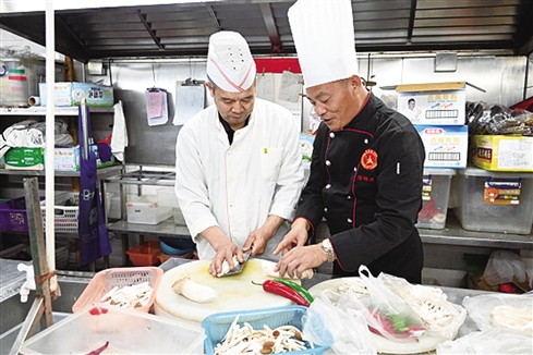 ■陈锦洪(右)向学员传授烹饪技术。单位供图