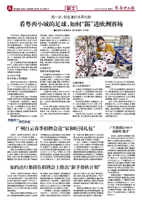 - 广汽集团近700个高薪岗“揽才” 本报讯 (全媒体记者郗建新 通讯员广汽宣)在近日举办的“百万英才汇南粤”2026春季大型综合招聘会上,广汽集团及旗下多家企业携近700个岗位亮相,线上线下接收简历超过1.3万份。 今年,广汽集