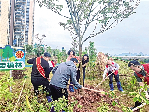 首期“劳模林”计划种植黄花风铃木和多色木棉共100棵。活动现场,大家挥锹挖坑、扶苗培土、踩实土壤,每一道工序都细致严谨、有条不紊。