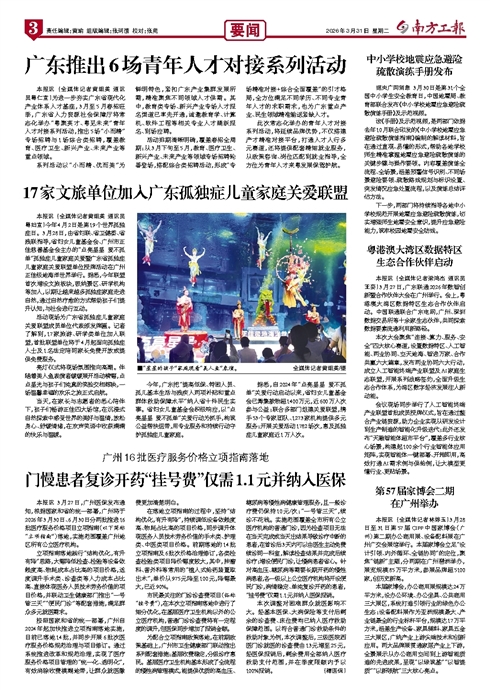 - 广东推出6场青年人才对接系列活动 本报讯 (全媒体记者黄细英 通讯员粤仁宣)为进一步夯实广东省现代化产业体系人才基座,3月至5月春招旺季,广东省人力资源社会保障厅将常态化举办“粤聚英才、粤见未来”青年人才对接系列活动,推出5场“小