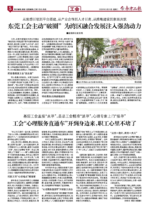 - 东莞工会主动“破圈” 为湾区融合发展注入强劲动力 ■2025年粤澳工会交流营活动现场。单位供图 今年,东莞市委锚定未来五年建设“智创优品、和美宜居”现代化新东莞的战略目标,提出深入实施“九大行动”,其中“湾区引领行动”置于首位。作为大湾区重要